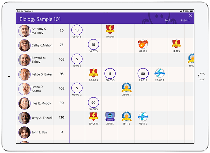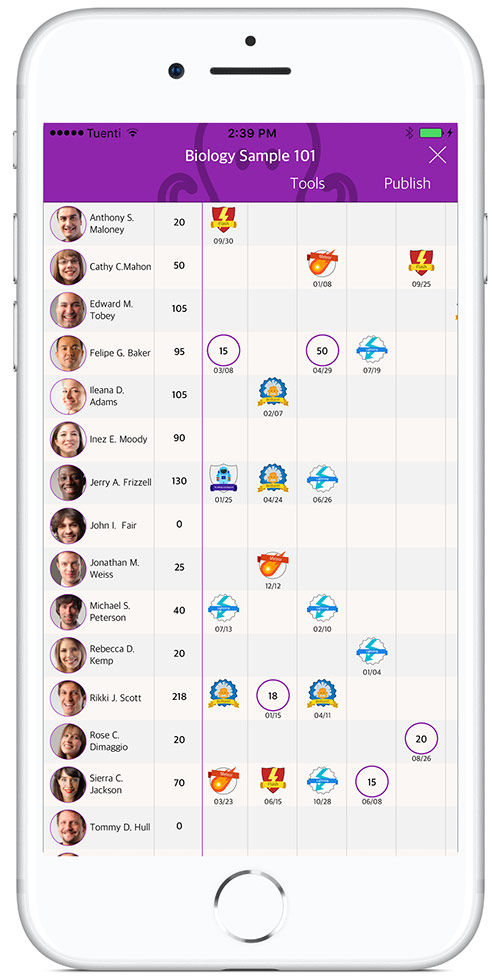 Badges and scores can be assigned individually or in bulk. Scores and badges are automatically timestamped.